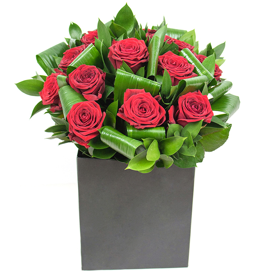 Add a touch of chic elegance to your space with our red rose bouquet, paired with aspidistra leaves and ruscus. This unique design offers a perfect blend of beauty and sophistication.